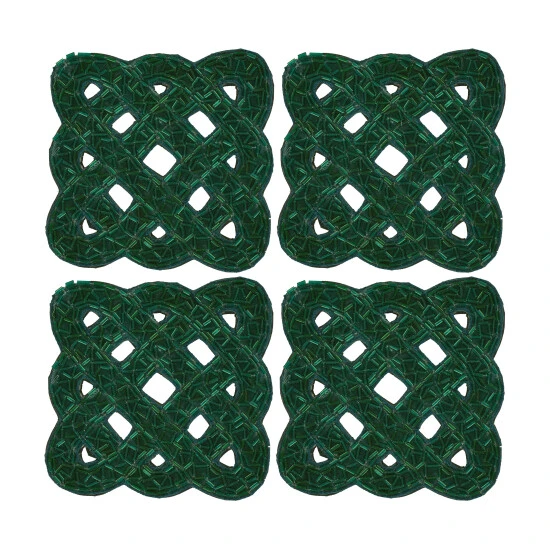 Celebrate the season in style with luxurious Christmas tableware that features just the right amount of glamour. The Nicholas 4 Piece Coaster Set features an intricately braided design with hand-crafted bugle beads. A truly tasteful piece of Holiday elegance that pairs beautifully with the Nicholas tableware and home accents. Available in crimson, gold, and evergreen color options.
