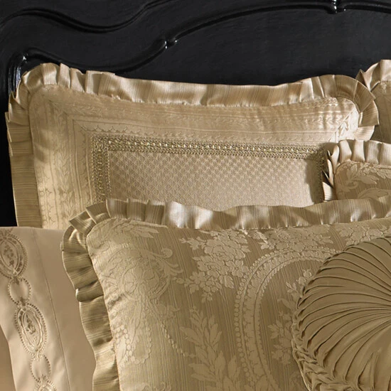 The Euro shams add dimension and drama to the ensemble. The ornate border is used as a frame on four sides of the delicate diamond trellis fabric and are finished with 1.5″ satin flange with rounded, pleated corners. The large-scale pillows reverses to the diamond trellis and use hidden zippers as closures.