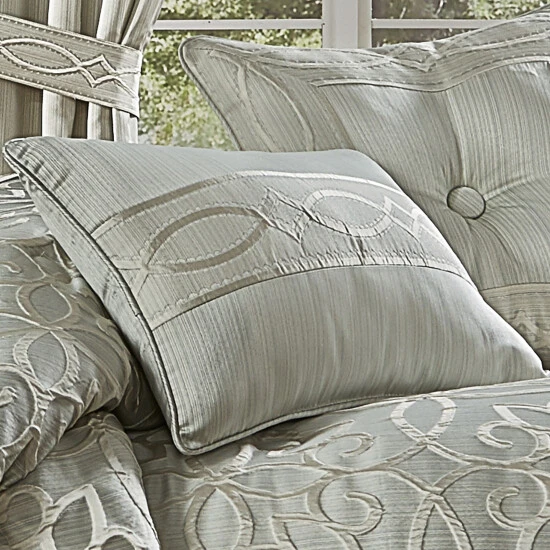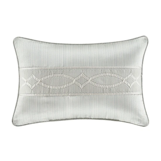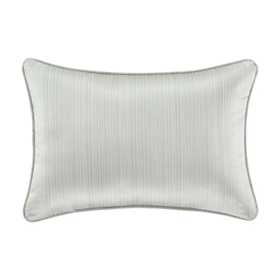 The Nouveau Decorative Boudoir Throw Pillow is constructed with a lustrous stria satin in spa blue tones, with a horizontal geometric jacquard placed in the center. This pillow reverses to the sleek stria satin and self-cord finish. Pair this luxury accent pillow with the Nouveau Bedding collection by Five Queens Court to complete the look.