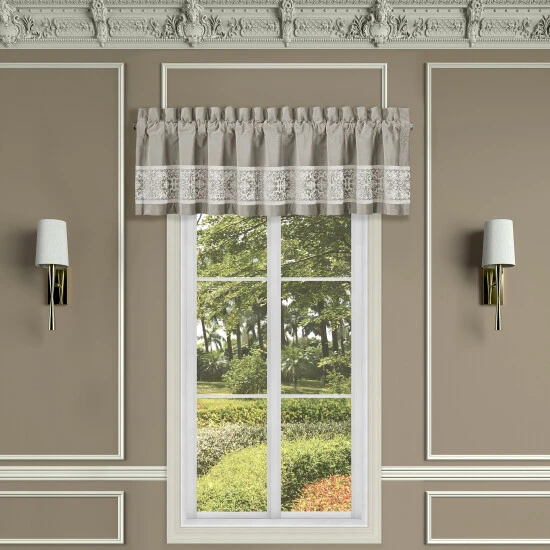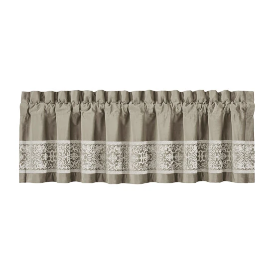 The Othello Straight Valance features a velvet linen color base fabric, with an engineered border of cream crewel embroidery that runs horizontally along the bottom edge. The delicately detailed embroidery along the valance creates a harmonious look to any bedroom. Add the coordinate Othello window panels and bedding collection to complete the look.