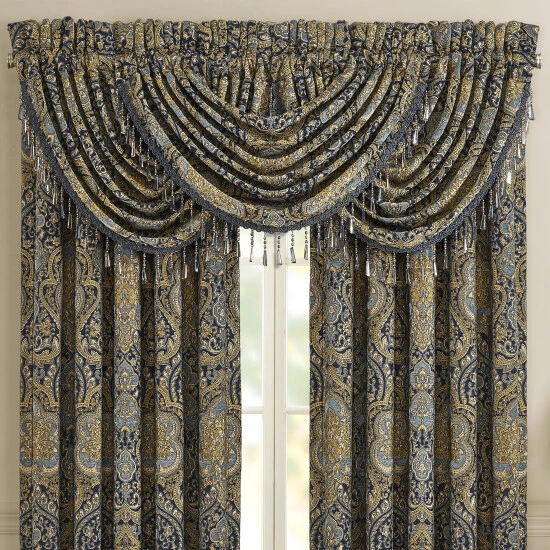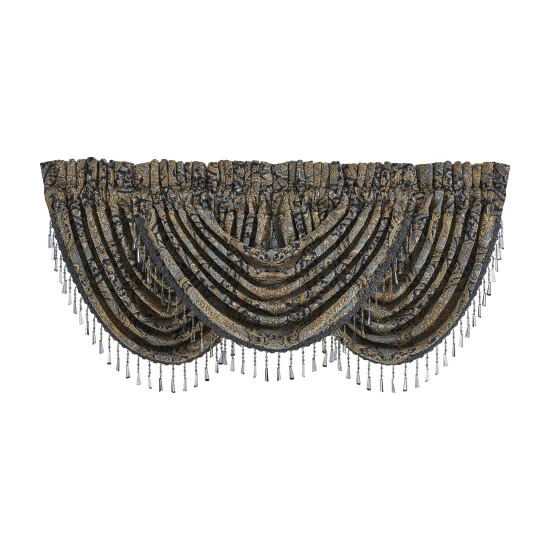 Create a custom look on your window with this elegant waterfall valance by Five Queens Court. The Palmer window valance is made of the same luxurious woven damask fabric as the Palmer window panels. They are trimmed with a crystal tassel fringe and rod pocket construction allows for easy hassle-free setup. In order to achieve the look in the photo, we suggest using three valances.