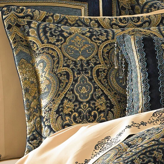 The Five Queens Court Palmer comforter set features a traditional woven chenille damask in rich tones of teal and navy combined with soft golds. The oversized comforter is embellished with solid indigo silk. The 4 pcs set includes: Β One beautifully designed decorator quality comforter. Two perfectly matched padded pillow shams with a hidden zipper closure. Pillow shams are engineered, centering the large ombre damask and finished with velvet piping. The bedskirt has a decorative stripe running vertically and contains split corners and a 15″ drop for a tailored look.