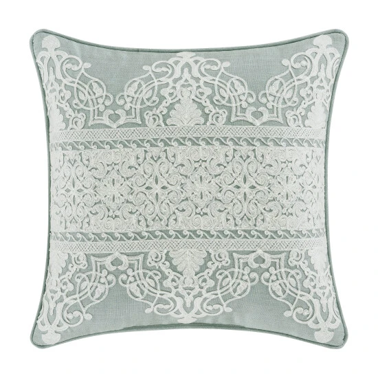 The Patrice 20″ Decorative Throw Pillow is exquisite with its sophisticated use of spa and cream tones. This beautiful square accent pillow is sophisticated with a transitional, ornate embroidered design on top of a spa faux linen, finished with a 1/4″ spa piping. Pair this pillow with the Patrice bedding set by Five Queens Court for a complete elegant look.