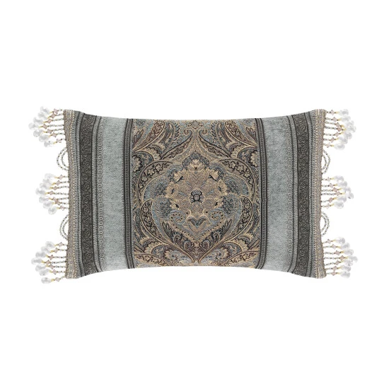 The Boudoir Pillow is intricately designed consisting of the chenille damask centered on the boudoir. The damask is bordered by the scroll chenille stripe on each end, and trimmed with a crystal beaded tassel.