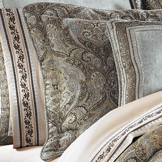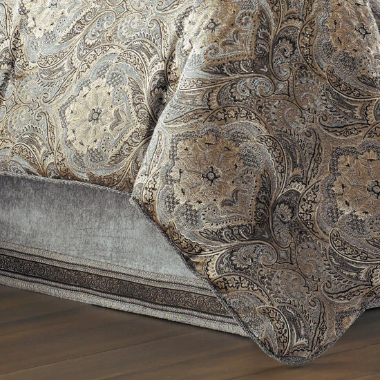 Paulina is a traditional design, consisting of an intricately woven chenille damask. The serene Stone color framed in a deep Chocolate color will complement any bedroom beautifully. All items are perfectly custom cut and sewn by hand. The comforters are generously oversized and overfilled and finished with a chenille foulard piping. The 4 pcs set includes: One beautifully designed comforter. Two perfectly matched padded pillow shams with a hidden zipper. The fabric is engineered so that the damask is perfectly centered on each pillow sham. The shams have a 2″ flange and are bordered with the chenille foulard piping, as used on the comforter. One solid Stone chenille bedskirt, bordered with a complementing chenille stripe, containing split corners and a 15″ drop.