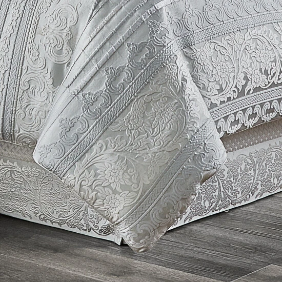 The Rivas 4 Piece Comforter Set is exquisite with its attention to detail and sophisticated use of spa blue and white colors. This beautiful woven horizontal stripe medallion pattern is rich with its 3-dimensional weave technique. Paired with matching hidden zipper pillow shams and an engineered split-corner bedskirt, this oversized ensemble will make you feel like a royal. The reverse of this set features a solid color spa fabric dyed to match the indigo color shown on the face. Pair this collection with the Rivas throw pillows and window treatments to complete the look.