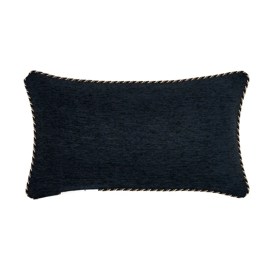 The Sayreville Boudoir Pillow is uniquely crafted with a woven chenille black and gold foulard design, and is framed with a tri-colored twist cord for added detail. The reverse side made with a solid black chenille which is made to coordinate with the Sayreville bed set.