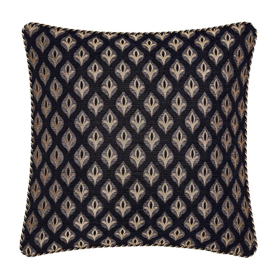 The Sayreville Euro Sham beautifully accents you bedding dΓ©cor with a stunning reversible option. Designed with a woven foulard design on the face in stunning black and gold and framed with a tri-color twist cord for added detail. The euro reverses to the solid black chenille and a hidden zipper closure along the bottom edge keeps the large pillow firmly in place, making it the perfect finishing backdrop to the Sayreville bedding set.