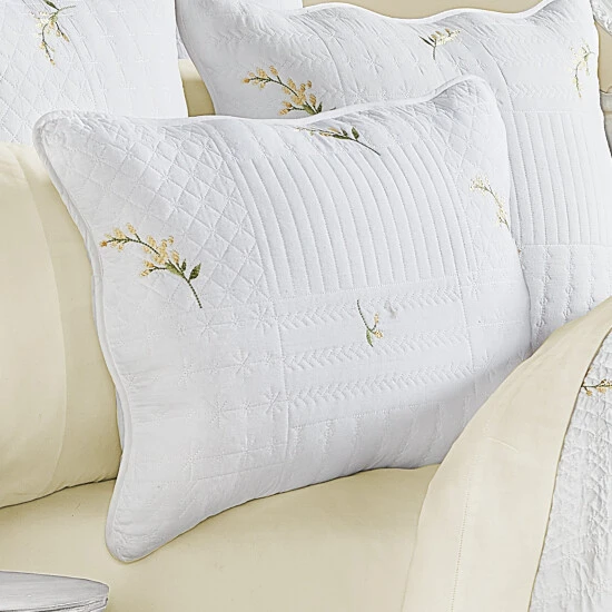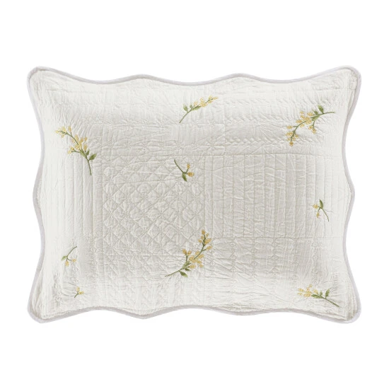 The Sharon quilted pillow sham features an all-over embroidered pattern of lovely yellow flowers. With a gently scalloped edge, and a beautifully detailed quilting pattern, this pillow sham is the perfect addition to the Sharon ensemble. The Pillow Sham is constructed with a hidden zipper closure making it reversible with a solid white on the back side to help change up this Cottage look.