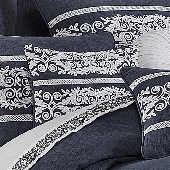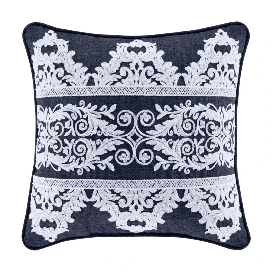 The Shelburne 16″ square decorative pillow is luxurious and elegant. Crafted in a soft faux-linen in a deep heathered indigo blue color with 3 bands of horizontal crewel embroidery scroll stripes in white. Pair this pillow with the Shelburne Bedding set for a complete elegant look.