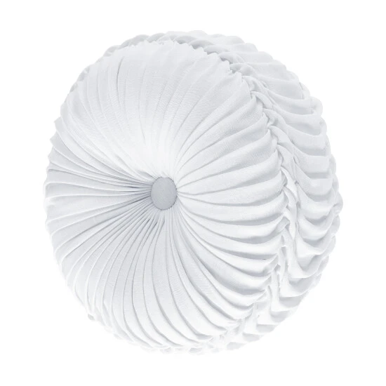 The tufted round pillow uses a white faux-linen texture fabric to create a one of a kind accent to this bedding ensemble. These unique pillows are sewn by hand and are finished with a fabric-covered button on both sides for added elegance and detail.