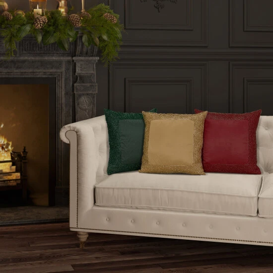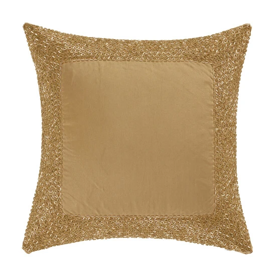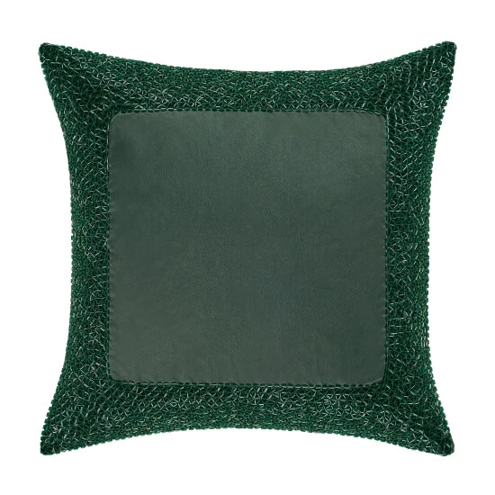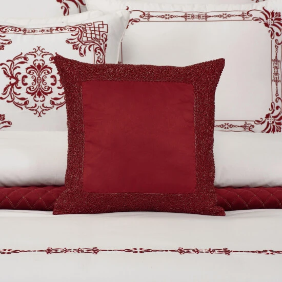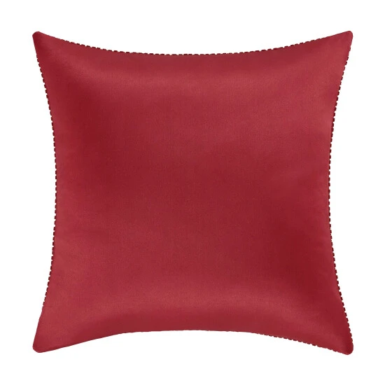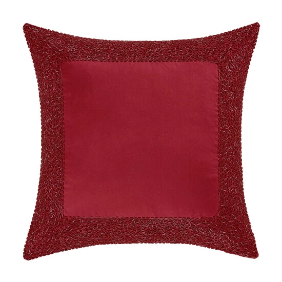 Celebrate the holidays at home with the Shimmer Pillow Mitered 16 Inch Throw Pillow that is embellished with highly engineered elegant details. Featuring a hand-crafted mitered bugle beaded band, and reverses to a dyed-to-match plush satin. Complete the Shimmer Pillow collection and decorate the season in style with luxurious Holiday bedding, bath and window from Five Queens Court. Available in stunning crimson red, gold, or evergreen color options.