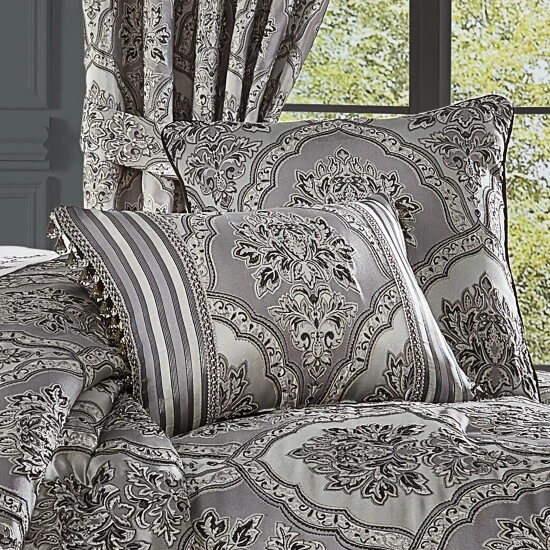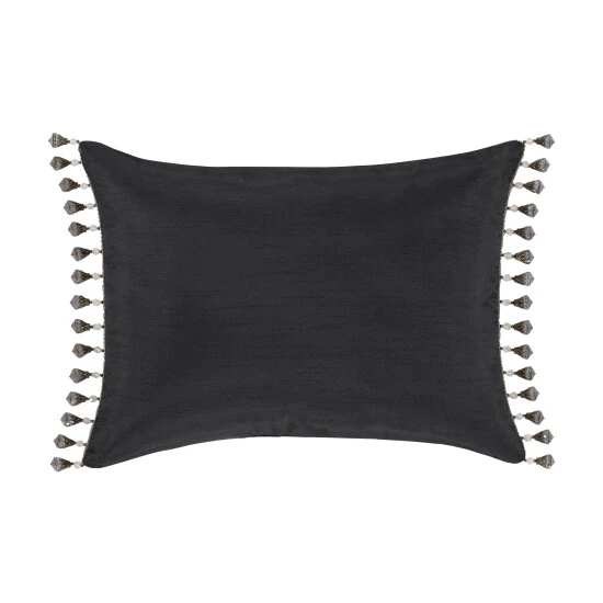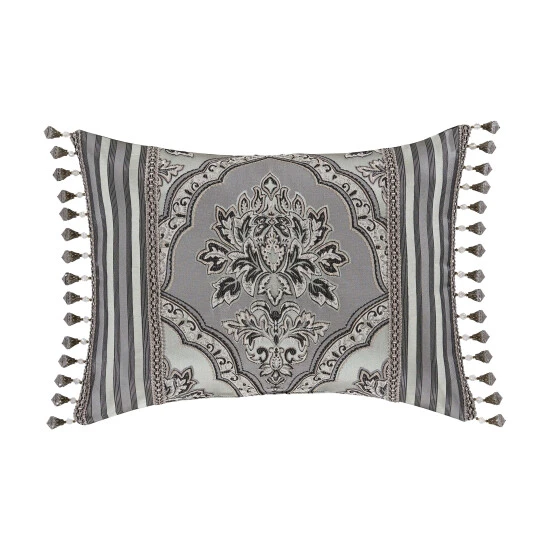 The Silverstone Boudoir Pillow is beautifully pieced with a centered woven damask and a woven stripe on either side. This decadent accent pillow is embellished with a sparkling crystal tassel fringe and gimp to complete this traditional luxury look. Pair this 15 x 21 pillow with the Silverstone bedding set by Five Queens Court for a complete look.