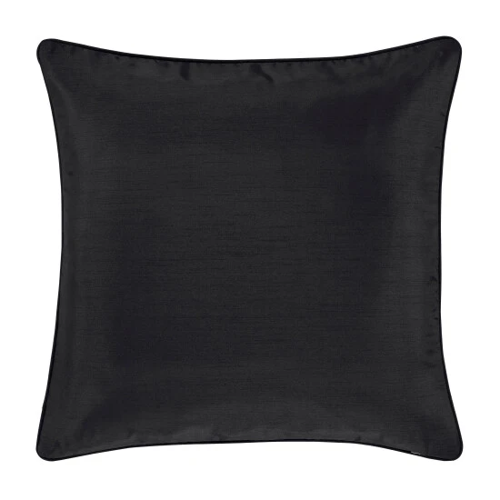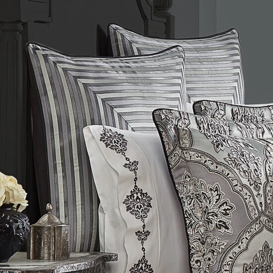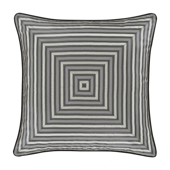 The Silverstone Euro Sham is beautifully engineered with a traditional silver and charcoal woven stripe mitered on the face. The reverse of this sophisticated pillow sham is a simple yet beautiful solid black faux silk with hidden zipper closure. This 26″ Euro Sham is the perfect backdrop to this traditional collection. The pillow sham is reversible and is finished with a decadent 1/4″ black piping. Pair this pillow sham with the Silverstone bedding set by Five Queens Court for a complete elegant look.