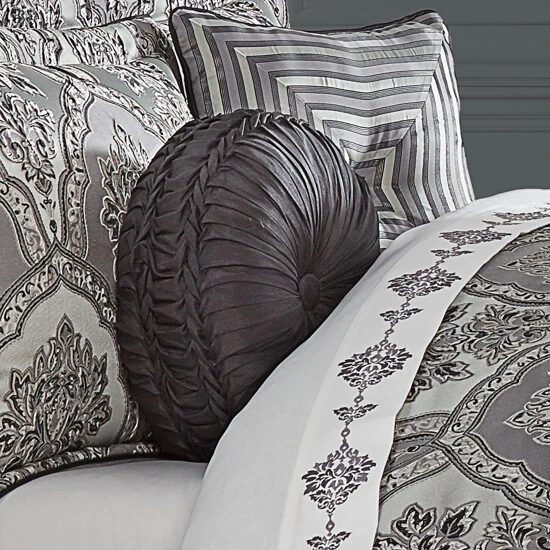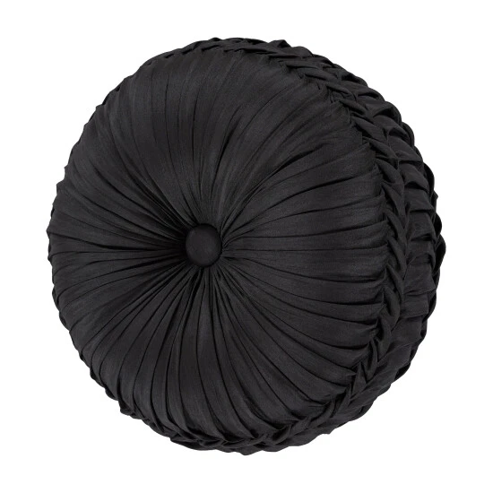 The Silverstone Tufted Round Pillow uses a beautiful black faux silk to create a one of kind accent to this bedding ensemble. This 15″ unique pillow is sewn by hand and is finished with a fabric covered button on both sides. Pair it with the Silverstone bedding set by Five Queens Court for a complete luxury look.