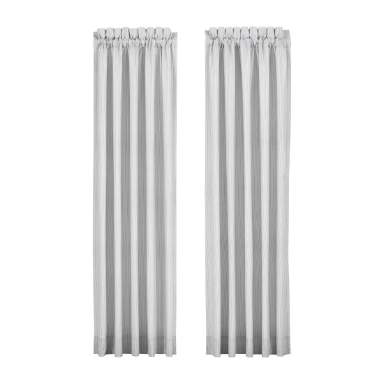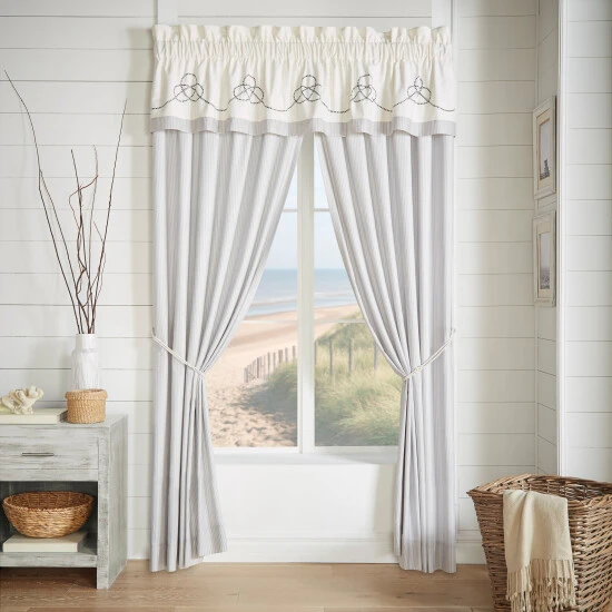 The Simona Window Panel Pair features a printed ticking stipe on a cotton base cloth. The vertical stripe adds length and depth to your windows. Lined with white microfiber for a softer drape and increased privacy. Including 2 novelty sailors knot tiebacks to enhance the coastal nautical appeal. The 3″ header and 3″ rod pocket make these panels easy to hang. Coordinate the window panels with the Simona window valance and bedding collection by Five Queens Court for a complete look.