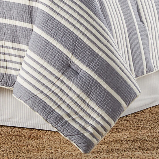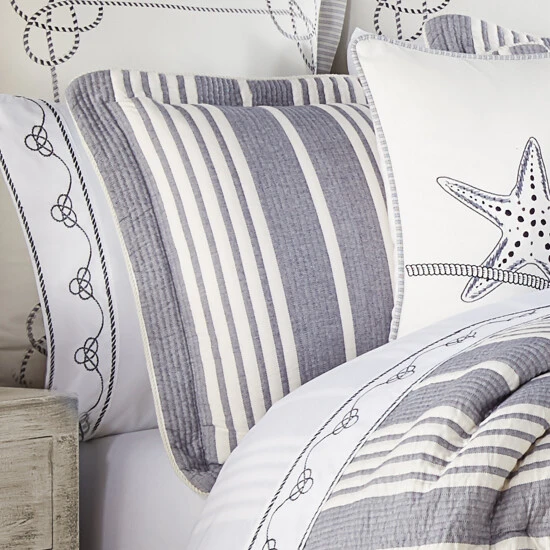The Simona 4 Piece Comforter Set bedding collection is cool, casual, and coastal. The comforter features a cotton/poly broad stripe matelassΓ© in navy and ivory. Finished off with a cotton twist cord to enhance the coastal theme, this oversized comforter is warm and cozy for a brisk ocean breeze feel. Paired with matching broad stripe matelassΓ© hidden zipper shams with cotton twist cord and a bedskirt printed with a ticking stipe on a cotton base cloth. The bedskirt has split corners and a 15″ drop. Pair this comforter set with the Five Queens Court Simona window treatments, throw pillows, and Euro shams for a complete look.