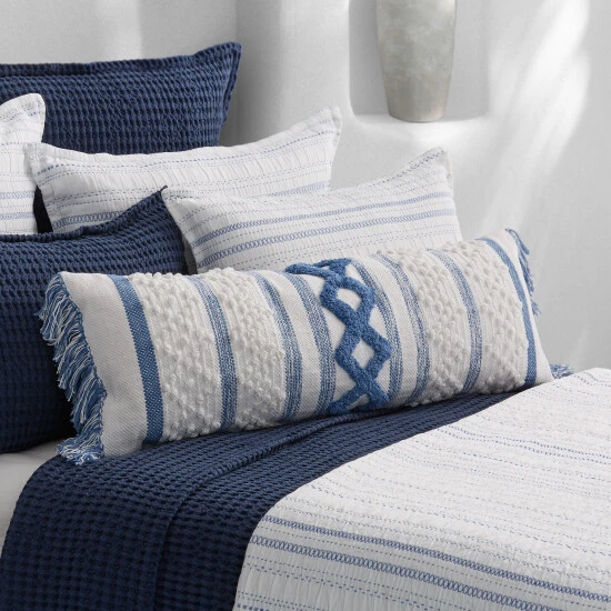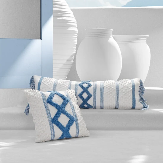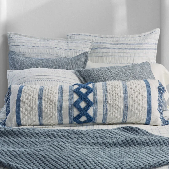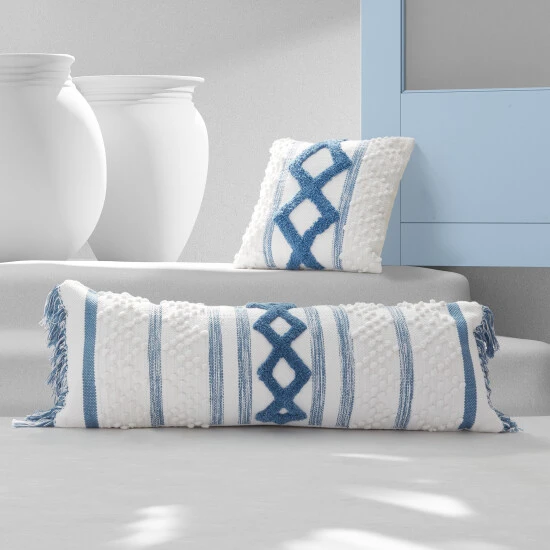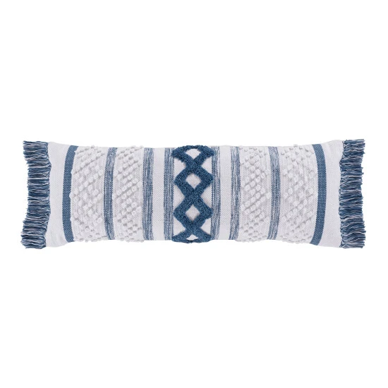 Crafted from exceptionally fine 100% Cotton yarns, the Five Queens Court Lumbar Throw Pillow adds relaxed versatility and effortless layering to your dΓ©cor. A Mykonos inspired color combination of optic white and blue hues beautifully adorn the multi-textured handloom construction. This lovely accent is finished with a fringed trim, adds a refreshed dimension to your space, and coordinates beautifully with the Serenity and Blue Bay Collections.
