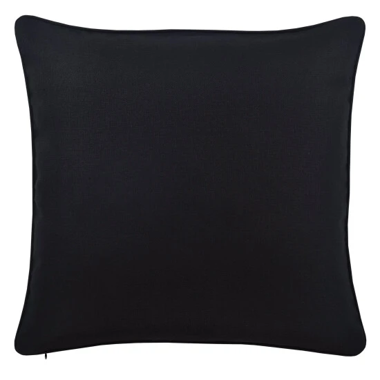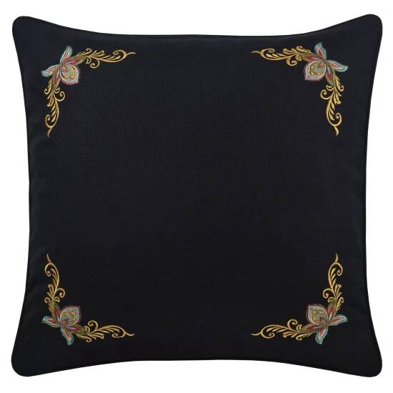 The Euro sham features a woven solid black fabric on the face and reverse. The face is embellished with a multicolored floral embroidery placed in all four corners. The fine details include a hidden zipper and 1/4″ piping for a tailored finish.