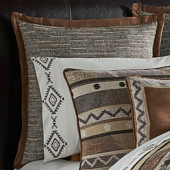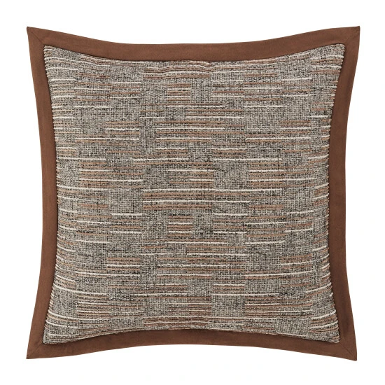 The Tatum Euro Sham is woven with an array of chunky yarns giving it a dimensional texture and hand feel. In shades of Linen, Tan, Ivory and Black and surrounded with a faux suede flange this woven Euro Sham is both rustic and elegant.