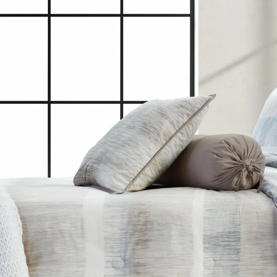 The Vernon 20″ decorative pillow features a plush 100% brushed twill cotton for a luxurious hand-feel. Layered shades of sandy neutrals and soft greys with a textured painter’s brush effect are contrasted with crisp white stripes. Designed with thoughtful pattern placement to create a striking yet soothing atmosphere in your bedroom. Add the coordinate comforter or duvet cover to complete your casual yet refined look.