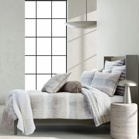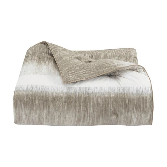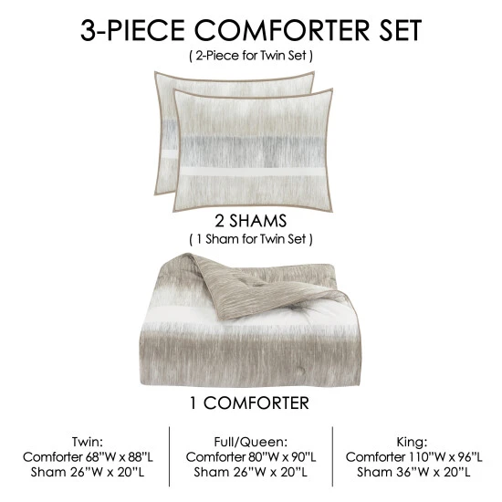 The Vernon Comforter Set offers a striking yet sophisticated style to your decor. A plush 100% brushed twill cotton base fabric is combined with layered shades of soft greys and sandy neutrals, with a textured brush effect contrasted with crisp white stripes. Designed with thoughtful pattern placement to create a soothing atmosphere in your bedroom. The oversized and overfilled comforter is completely reversible, with a luxurious hand-feel. The set includes : One comforter and two softly padded pillow shams (1 sham is included for the twin size).