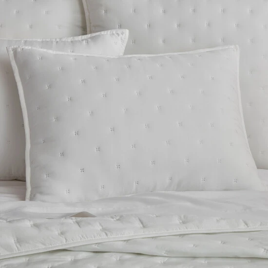 The Vito Quilt Set features our signature stonewashing finish to create lived-in softness and quality comfort. Constructed with a subtle geometric pattern made with pinsonic quilting. This lightweight quilt includes 2 matching pillow shams and makes for the perfect layering piece for extra warmth or supple comfort on its own. Available in 3 color options: optic white, slate denim blue, and light pear green. Pair this quilt with the Vito accessories for an updated transitional look.