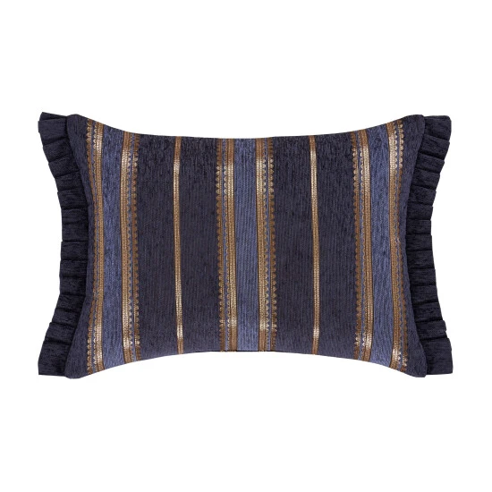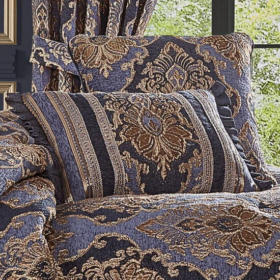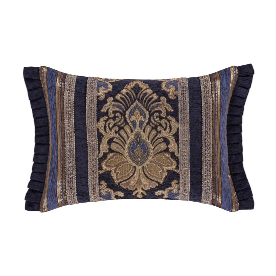 The Woodstock Boudoir is beautifully pieced with a centered woven jacquard damask and a jacquard stripe border with indigo chenille fabrics. This decadent pillow is embellished with a sparkling crystal tassel fringe and braided gimp to add a traditional luxury look to your decor. Pair this 15 x 21 inch pillow with the Woodstock bedding set by Five Queens Court for a complete look.