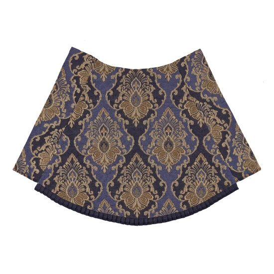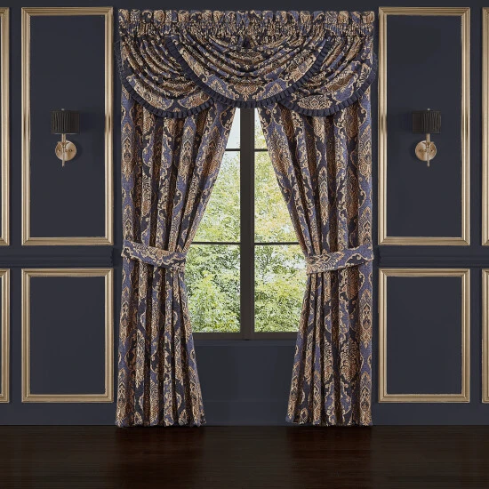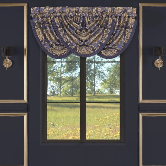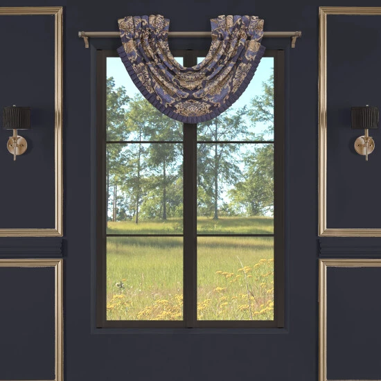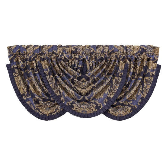 The Woodstock Waterfall Valance is exquisite with its fine details and sophisticated use of blue and indigo. This beautiful woven jacquard damask window treatment is rich with its 3-dimensional weave and satin finish. Embellished with a pleated fringe, this valance will add luxurious elegance to your decor. Window shown with three valances (each sold separately).